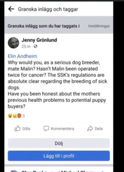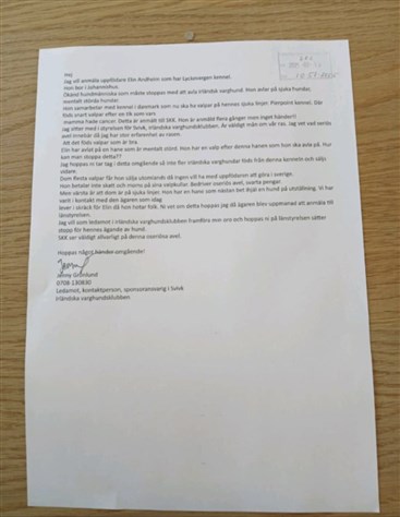 Skrämmande är att hon sitter med i rasklubben. Är detta bra för en rasklubb. Detta skadar både rasen och uppfödare. Hon har anmält mej till Länstyrelsen i sin roll i rasklubben.