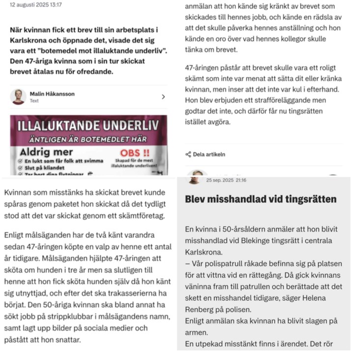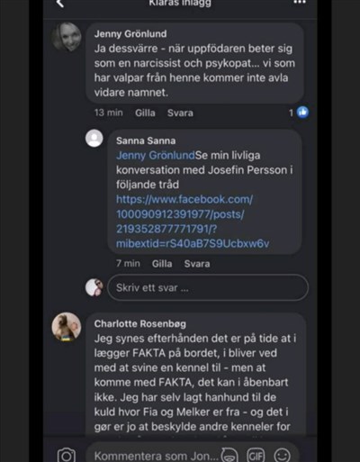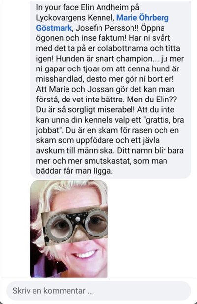 Jag ska dödat mina hundar för försäkringspengar, brutit ben på min valp för jag inte hade köpare, gett sig på min familj, skrivit ut att jag avlar på cancer sjuka djur, skickat prankbrev till min arbetsplats. Anmält till mej till SKK och Länstyrelsen.
